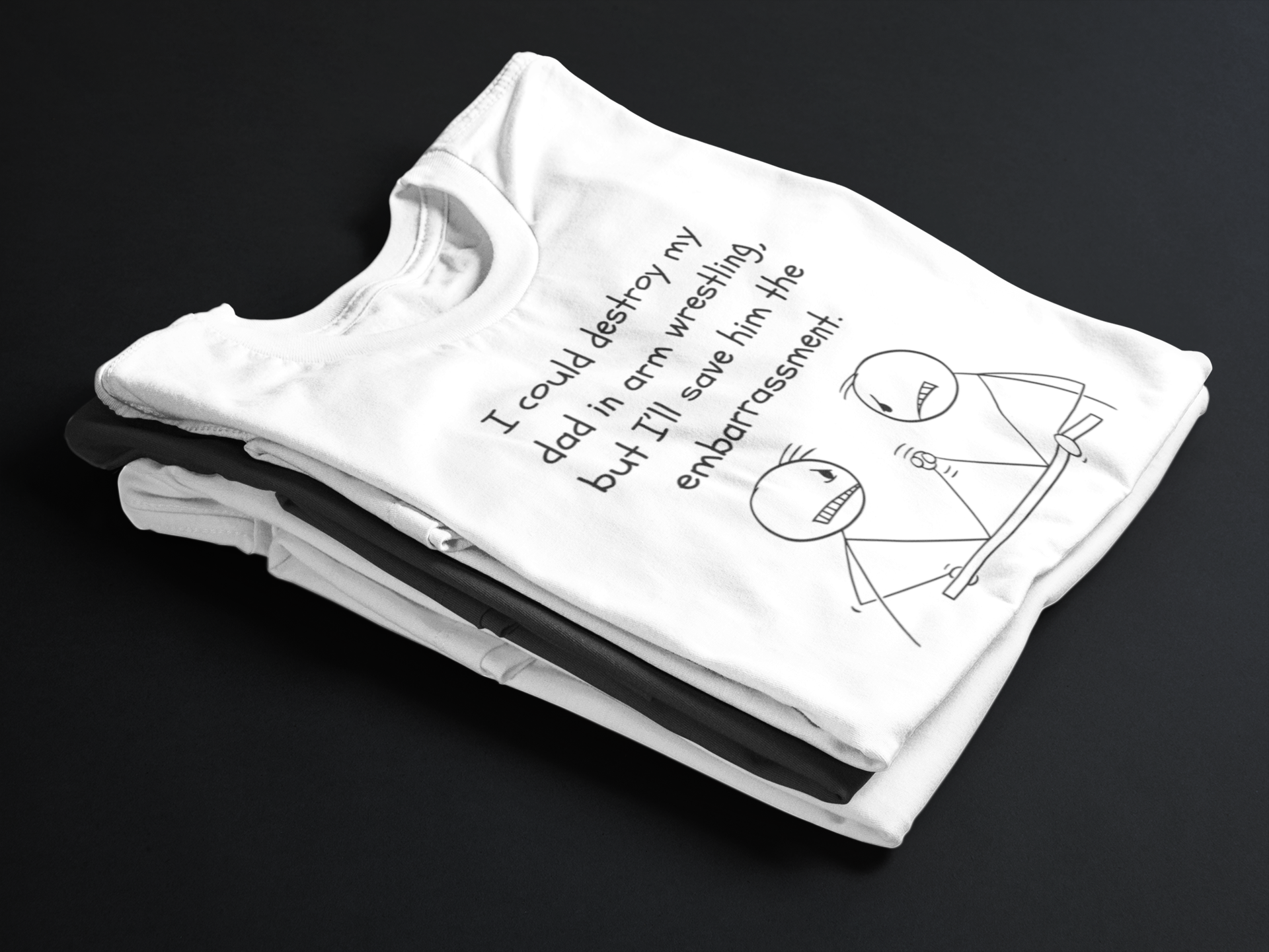 Timmy flexed his muscles and stared at his dad. "I would destroy you in arm wrestling... but I’ll save you the embarrassment."
